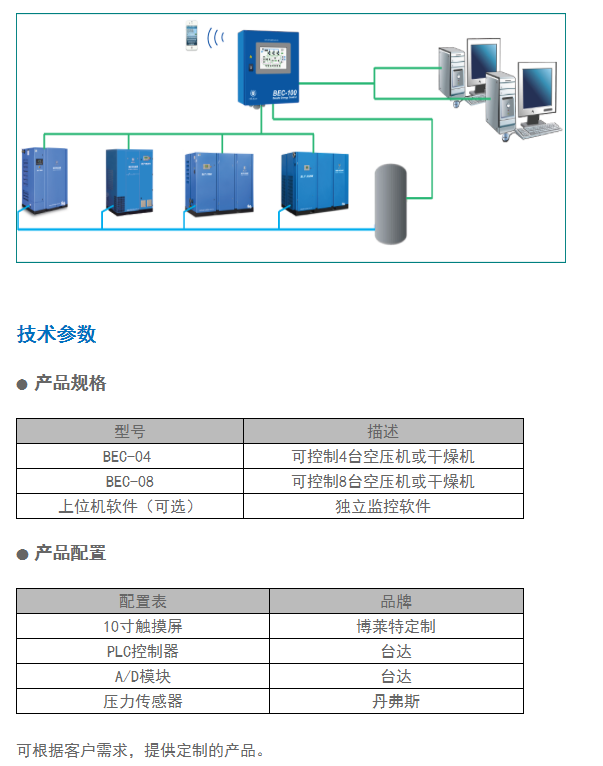 可利用电脑网络监测系统进行远程控制,以计算机为主机,空气压缩机运行控制器为从机。根据显示数据远程发送相应控制命令给空压机控制器。